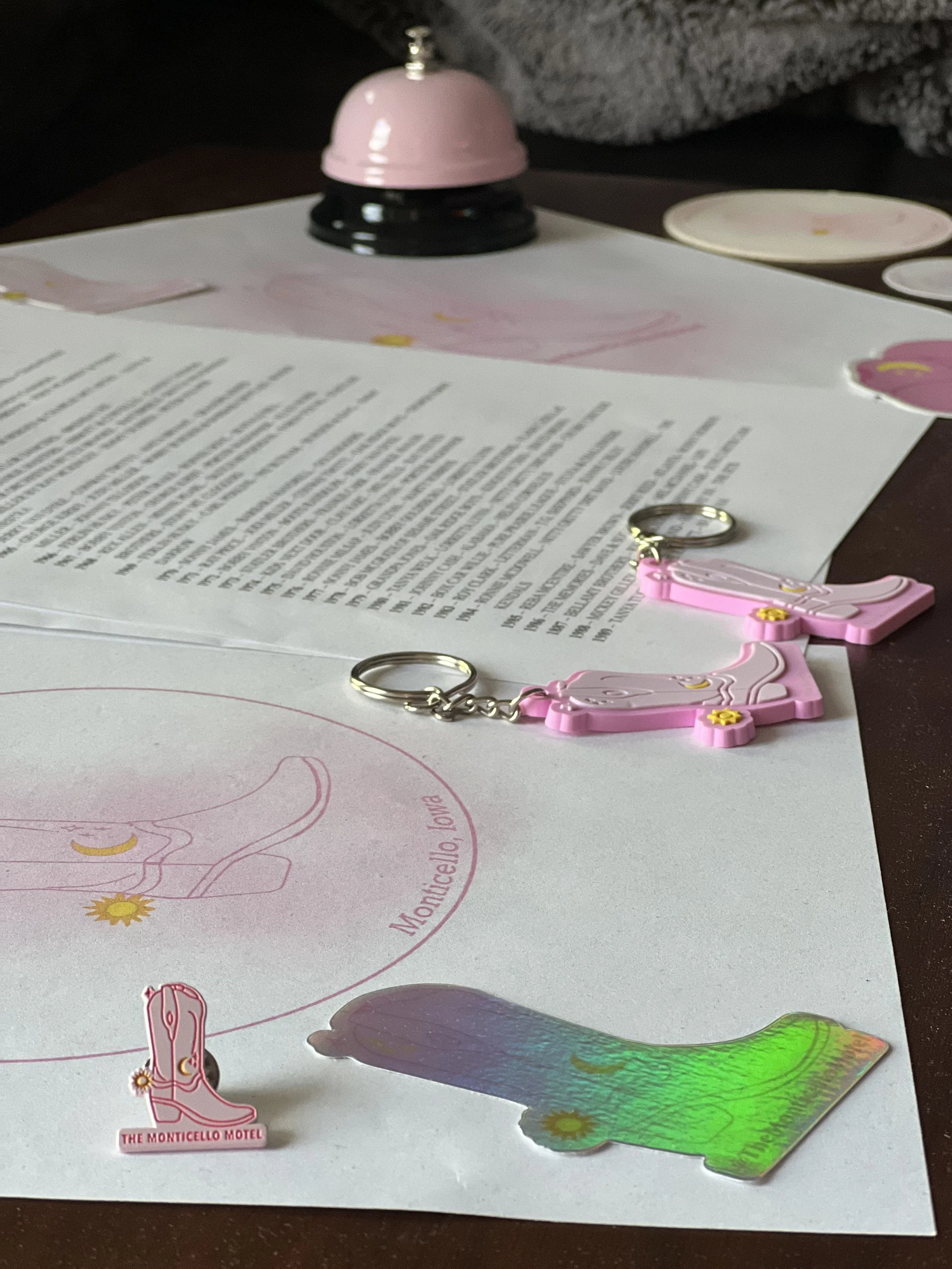Motel Gift Shop Motel Nights Box Set from $50.00 Lipstick Kiss Embroidered Robe $120.00 Motel Room Lipstick Kiss Keychain $5.00 Vintage Neon Sign Sketch Vinyl Pin $3.00 Lipstick Kiss Wine Glass $10.00 Space Cowgirl T-Shirt $40.00 Space Cowgirl Sticker v2.0 $3.00 Space Cowgirl Boot Enamel Pin $5.00 Space Cowgirl Sticker v1.0 $3.00 Space Cowgirl Keychain $5.00 Neon Sign Enamel Pin $5.00 Neon Sign Keychain $5.00